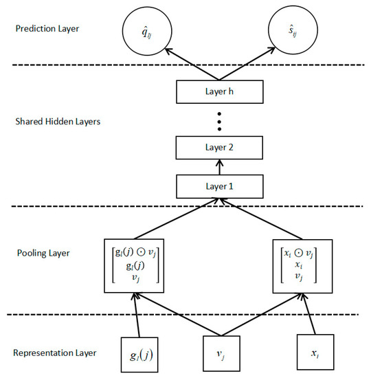 , , and represent the weight matrix, bias vectors and output neurons of the hidden layer of layer respectively. They are activated by function. Finally, the last layer is output to calculate the prediction score: