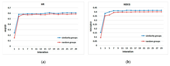 Figure 6a,b shows the performance of iterative training for highly similar groups and random groups under optimal parameters respectively. The blue line represents high similarity groups and the red line represents random groups. We note that compared with the random group, the high similarity group made certain progress in both indicators, and its performance tended to be stable after 15 iterations. We verified our view through this experiment. The higher the overall similarity of the group users, the more satisfied they were with the items recommended by the group, and the better the group recommendation performance.