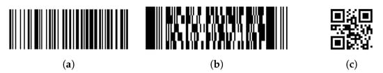 A barcode allows a faster capture of data, the immediate integration of the decoded data in the system and low-cost printing. There are two main different kind of barcodes: one dimensional (Figure 1a) and two dimensional ones (Figure 1b,c). One dimensional barcode allows us to store a limited amount of information and it consists of a group of bars and spaces that are designed to be scanned and read on a computer. However, the main problem is that it has a small storage capacity that ranges between 20 and 30 digits. Among them can be mentioned Ean 13, Ean 8, Code 128, Dun 14, Upc 39. On the other hand, barcode labels have a control digit that prevents the scanning tool from losing data and data that does not pass the setpoint digit test will not be entered into the system [43]. Two-dimensional barcodes allow to store more information than one-dimensional barcode, for example, the PDF-417 can store a maximum of 1800 alphanumeric characters (ASCII) or 1100 binary codes for each symbol (each rectangle in the form of a “point cloud”). Another two-dimensional barcode is the quick response (QR) code, approved as ISO international standard (ISO/IEC18004) and It uses four standardized encoding modes: numeric with a data capacity of 7089 characters, alphanumeric with 4296 characters, byte/binary with 2953 bytes and kanji (Japanese writing) with 1817 characters [44]. In security terms, a QR Code could be manipulated to change the encoded information and it is possible to carry out SQL injection, command injection phishing and pharming attacks, reader software and social engineering attacks [45].