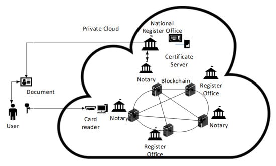 Figure 2 shows the network architecture in a distributed and decentralized way including all the nodes of the network, the database that forms the blockchain and government entities. The network is intended as a private cloud, where only the nodes located in the notarial and registry entities can be part of it. The network consists of three types of nodes: the first are located in the register offices, which are in charge of issuing a new or a duplicate identity document when the citizen personally makes the request. In addition, they are the only certified entities able to generate the digital certificate with the corresponding public and private keys for each citizen by using a user’s PIN. With this digital certificate, the citizen will be able to sign digital documents (for example, when creating its account) or perform transactions, and authenticate itself with the competent authorities. The second type of nodes are located in notary offices, which are responsible for keeping the record of the people’s civil status, attesting the correspondence of people’s identity and their corresponding document, by giving testimony of people’s authenticity.