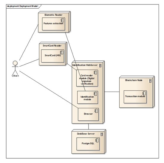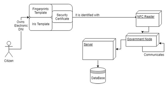 The block diagram of a node in the proposed network architecture is shown in Figure 3. The citizen which owns its own electronic ID, where fingerprint and iris template are stored, generates a security certificate through a match on card (MoC) system. MoC system allows local verification of the templates stored on the card, these are read by a standard 32K Near Field Communication (NFC) storage chip and governed by the common criteria Evaluation Assurance Level (EAL) 5, allowing the authentication of the user against the national government through generic software. During the operation, the transaction is protected by the media on the card and by the encryption offered by the Blockchain. All nodes are aware of the existence of the transaction but only the receiver knows the content.