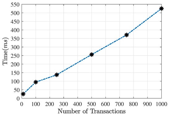 Figure 6 shows the calculated time for the mining process of one block and the posterior broadcasting process of this block to every node in the Blockchain system. In this test was used a lab computer, varying the number of transactions, in order to obtain an estimated time. According to the figure, for mining one block containing one thousand (1000) transactions, the spent time was approximately five hundred and thirty (530) milliseconds.
