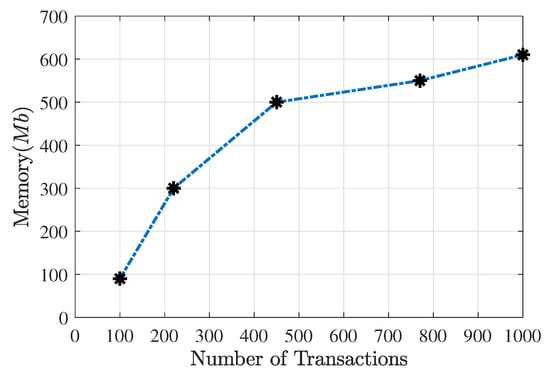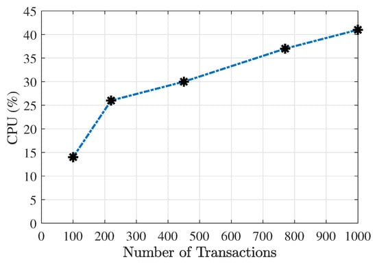 Figure 8 shows the CPU usage by a miner computer in the broadcasting process. At first, between one hundred and two hundred (100–200) transactions, the memory consumes rise quickly but after two hundred ten transactions, it continues to rise but to a lesser extent. In this way, for broadcasting one thousand (1000) transactions, the CPU usage amounts to approximately 43%.