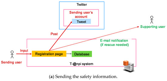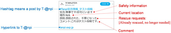 The above background highlights the need for a novel system through which victims can share their safety information, make rescue requests, and enable quick information gathering for decision making by local government staff or rescue experts. In this paper, we propose a Twitter-based safety confirmation system (T-@npi), a web application that can be accessed by any web browser or device connected to the Internet [23]. The name T-@npi derives from the Japanese word “安否” (pronounced anpi), meaning the degree of a person’s safety. This paper introduces the operation of T-@npi and a preliminary operational test of the system. The remainder of the paper is organized into Section 2, which describes the related services and studies, and Section 3, which explains the proposed T-@npi system and performs an operational test of safety-information registration by the system. The paper concludes with Section 4.