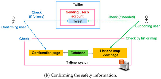 The system is outlined in Figure 1. Figure 1a explains the operation of registering and sending the safety information. Sending users access the T-@npi system through a web browser and enter their safety information on the registration page. This information is simultaneously recorded in the database of the T-@npi system and tweeted on the user’s Twitter account. If the user tweets a rescue request, the information is emailed to a supporting user. The e-mail notification is an additional channel that improves the reachability of the rescue request to supporting users. When the sending user reregisters the safety information, the database record is renewed, and the previously posted tweet is deleted. If the reregistering sender has previously requested a rescue, the renewed information is also emailed to the supporting user. Figure 1b explains the operation of confirming the safety information. The confirming users who follow the sending user can find the safety information on the sending user’s Twitter timeline. If needed, the confirming user can then distribute this information on Twitter. The supporting users can determine the status of their supported disaster area and view a list or map of the safety information submitted by the sending users from the system’s database.