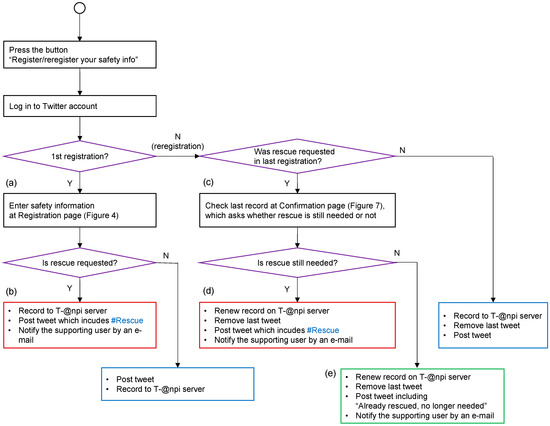 Figure 3 shows the flow of registering and reregistering the safety information. A first-time sending user registers the information by pressing the “Register/reregister your safety information” button on the index page (Figure 2). After a Twitter authentication, the registration page shown in Figure 4 appears (Figure 3a). The registration page displays the items to be provided by the sending user.