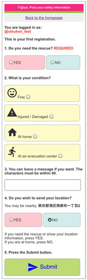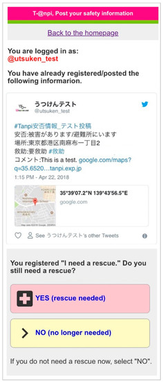 Once the “Submit” button is pressed, the relevant information is recorded on the system, and a tweet is posted on Twitter (Figure 3b). The information of a rescue request is notified to the supporting user by e-mail. The confirming user following the sending user can check the sender’s tweets on Twitter. Figure 5 is an example tweet of the safety information when the sending user needs a rescue and provides his/her current location information. Figure 6 is an example tweet of the safety information provided by a user not needing rescue, and who does not provide the current location.