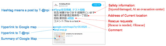 - Abe, M.; Uchida, O.; Utsu, K. Operability improvement of twitter-based safety confirmation system for disaster situations. In Proceedings of the 2017 International Conference on Parallel and Distributed Processing Techniques and Applications (PDPTA), Las Vegas, NV, USA, 17–20 July 2017; pp. 203–208. [Google Scholar]