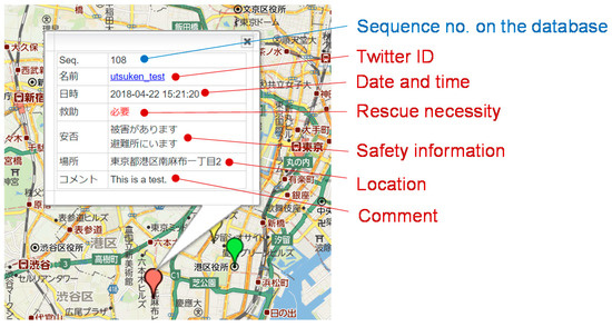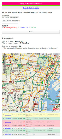 The proposed system displays the safety information recorded on the database in both tabular and online map (Yahoo! Japan map) formats. In this way, supporting users can collect the safety information and support victims. Figure 11 shows the map view of a rescue request on this page. The supporting user can filter the information by location and/or rescue-request selections, sort the information on the table, and view it. The mapping is accomplished on Yahoo! Japan online map via the JavaScript Map API [47]. The map displays only the safety information that is accompanied by location information. Table 1 provides the meanings of the icon markers on the map and the background colors in the list. When users click on an icon, the information related to that icon is displayed in a balloon (Figure 12). The table and map provide the sequence number on the database, the Twitter ID, the registration date and time of the information, the rescue necessity, the safety information, the location of the information when registered, and a comment. The rescue necessity is one of “必要 (needed),” “不要 (not needed),” or “解決 (no longer needed)”.