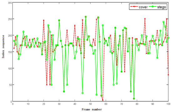 It can be seen that the index values of the “cover” and the “stego” are not completely coincident. The points with the same position indicate that the optimal code word for both is the same, and the points with different positions indicate that the optimal code words are different. Some points have small differences, and the location of some points is very different. This represents the degree of difference in the output index values.