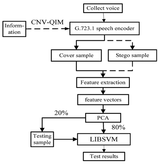 Experiments were conducted on five categories of Chinese male voice (CM), Chinese women voice (CW), English male voice (EM), English women voice (EW), and hybrid voice (Hybrid). For each of the above data sets, 80% of the “original carrier” and the corresponding “density carrier” samples were selected for the training sets, and the remaining 20% of the samples were used as the test sets. To test the performance of the steganalysis algorithm, the specific process is shown in Figure 6 [18].