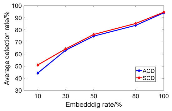 Since different embedding rates during information steganography will affect the result of steganalysis, we use five different types of embedding rates for 10%, 30%, 50%, 80%, and 100%. The average detection rate (%) of ACD and SCD is shown in Table 4.