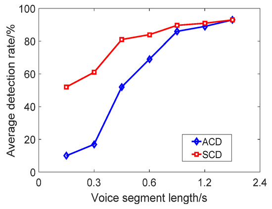 In order to more intuitively compare the performance of the two types of detection, Figure 9 shows the relationship between the average detection rate of the five data sets and the duration of the speech segment. It can be seen from Figure 9 that the longer the duration, the higher the average detection rate of ACD and SCD. The longer the speech duration, the more embedded secret information. This results in a significant change in A and M, and thus the detection rate is higher. When the length of the test reached 3 s or more, the average accuracy of ACD reached more than 85%. When the length reached 2.4 s or more, the average accuracy of SCD reached more than 85%. It shows that ACD is more sensitive to different duration, and SCD is more suitable for detection of different durations.