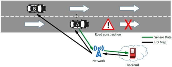 A schematic overview of the use case is shown in Figure 2: A first vehicle detects a lane that is closed because of construction work. It sends its sensor data to a backend in the cloud, where the new information is incorporated into the map. The updated map is then sent back to all connected vehicles in the vicinity.