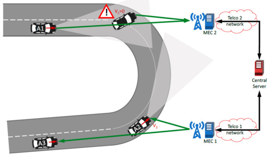 - Vazquez-Gallego, F.; Vilalta, R.; García, A.; Mira, F.; Via, S.; Muñoz, R.; Alonso-Zarate, J.; Catalan-Cid, M. Demo: A Mobile Edge Computing-based Collision Avoidance System for Future Vehicular Networks. In Proceedings of the IEEE INFOCOM 2019—IEEE Conference on Computer Communications Workshops (INFOCOM WKSHPS), Paris, France, 29 April–2 May 2019. [Google Scholar]
