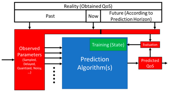 A QoS prediction scheme, as shown in Figure 4, targets the assessment of the experienced quality of service for each client and the timely notification. It monitors different parameters of the network and environment from present and past to obtain a prediction. Furthermore, prediction algorithms can learn from past decisions to improve their accuracy or be trained.