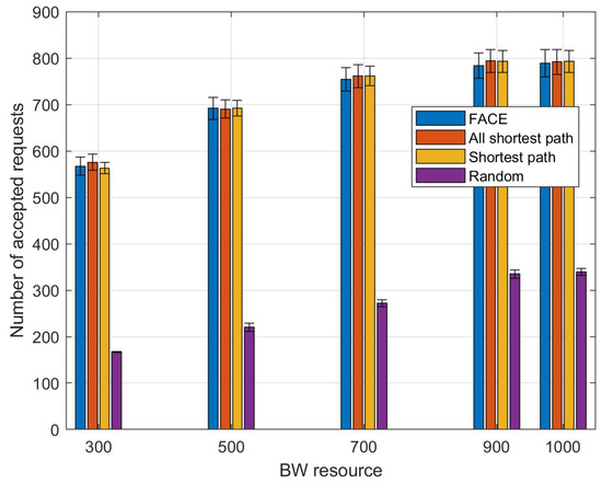 In the second scenario, we apply our 4 proposed heuristics to a 100 nodes network. We chose a network with 100 nodes in order to have more shortest paths available for each pair of nodes in comparison to smaller networks and be able to compare the performance of the all-shortest path and FACE with the one that only considers one shortest path. We vary the uniform distribution that the physical links’ BW is chosen from to model increased bandwidth availability. The intervals are [300, 400], [500, 600], [700, 800], [900, 1000], [1000, 1100]. As can be seen from
