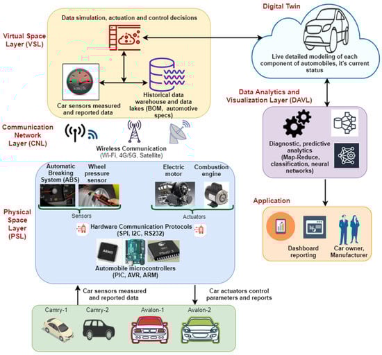 To further elaborate on the proposed end-to-end conceptual model of a digital twin in the context of cars, assume that we have four different types of cars of two models, namely, Toyota Avalon and Camry. The system collects a set of physical parameters from the cars while they are on the move: ABS, transmission, mileage, and tire status from the on-board car sensors. The vehicle’s 2D/3D models, bill of materials (BOM), and historical data are stored in the virtual twin in the virtual space layer, as shown in Figure 3.