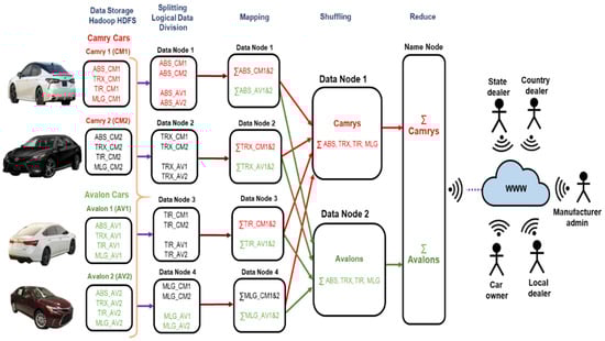 - Mapping: In this phase, the data split across each cluster are sent to a mapping function to return an aggregated value for each type of car model with respect to a specific parameter. For example, the mapping function in data node 1 returns an aggregated output for ABS for each car’s model (Avalon and Camry). Similarly, mapping function from other data nodes returns the sum of transmission, tire status, and mileage values for each model of the cars.