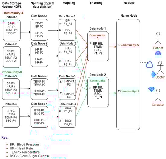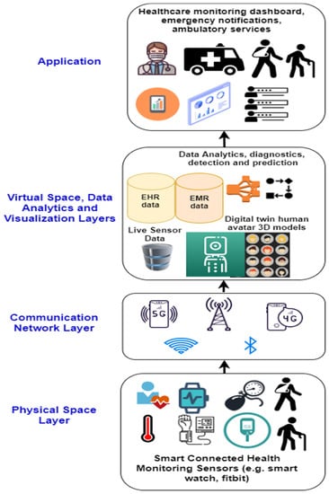 Another use-case application for the proposed model is in the context of a smart healthcare patient monitoring system wherein the vitals of a mobile human can be monitored continuously from the physiological sensors attached to the human’s body. These sensors as well as human avatars will be replicated in the virtual space as a digital twin. Additionally, data about the patient’s health history will be collected and stored as electronic medical records (EMRs) and electronic health records (EHRs) in the virtual space of the proposed model unlike the BOM data in industrial use. This medical record dataset can be accessed from []. The collective data from real-time sensors and health history dataset in the virtual space of the digital twin will help in making accurate predictions on the status of a human’s health while he/she is in motion. The proposed end-to-end digital twin conceptual model in a smart healthcare application is demonstrated in Figure 5. A corresponding processing and analytics’ paradigm for a smart healthcare digital twin in DAVL layer is represented in Figure 6.