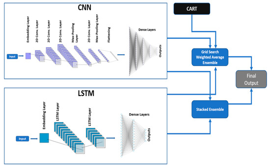 In the proposed ensemble model, it merges ML and DL models based on weightage or stacking [30], as shown in Figure 2. The model averaging ensemble combines prediction from different models and generally improves the performance. A grid search weighted average ensemble is used for this purpose. The model weights are values assigned to different models based on their individual performance. Weight values normalized values between 0 and 1, such that the weights across all ensemble members sum to one. Some models can have high sensitivity, whereas some might have high specificity. Combining them with respect to their performance without completely discarding any models will improve the performance.