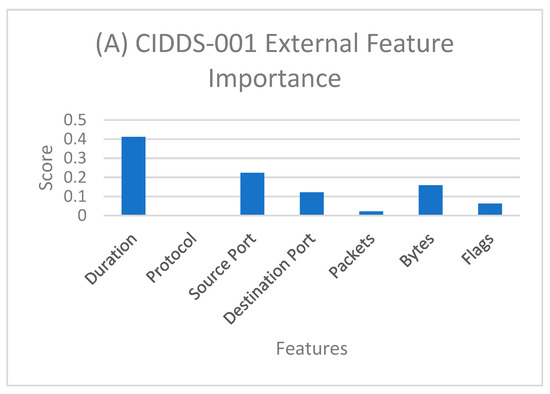 The reason flags scored higher in combined dataset similar to that of CIDDS-001 is because CIDDS-001 is nearly eight times larger than CIDDS-002. So, the feature importance score is biased towards the CIDDS-001 dataset. Due to the difference in the number of classes in the internal and external datasets, we can observe the difference in feature importance for different attributes for respective datasets.