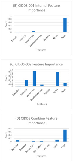 Feature importance for (A) CIDDS-001 external server; (B) CIDDS-001 internal server; (C) CIDDS-002; (D) CIDDS combined dataset.