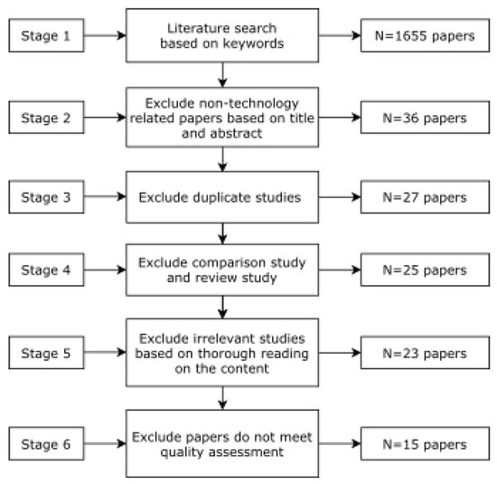 The peer-review process was then conducted to validate the selection process. The 23 papers left were then screened by assessing its quality. We determine the quality criteria adopted from Uzun and Tekinerdogan [37] for assessing the quality of the papers. A dichotomous (‘‘yes” or ‘‘no”) scale was used to grade each of the criteria. Based on the assessment results and discussion between researchers, of the 23 articles assessed for quality, 8 papers were excluded. The remaining 15 papers (study A–O) were left for further extraction and synthesis. The overall literature search process is shown in Figure 2.