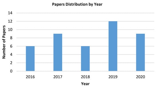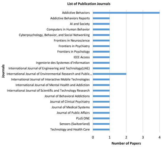 The second stage of the study selection process extracted 36 technology-related studies. These studies involve the use of IT in the digital addiction context. The number of papers distributed by year is shown in Figure 3. The highest number of papers on the use of IT in digital addiction is found in 2019. However, the number of papers published in 2020 may still increase since the literature search was only conducted until September 2020. Of the 36 papers found in the second stage, 26 papers are published in journals and 10 papers are published in conference proceedings. Figure 4 shows the journals where the 26 papers are published. From Figure 4, we can see that the research on digital addiction is conducted from various disciplines, such as psychology, medical, public health, and information technology.