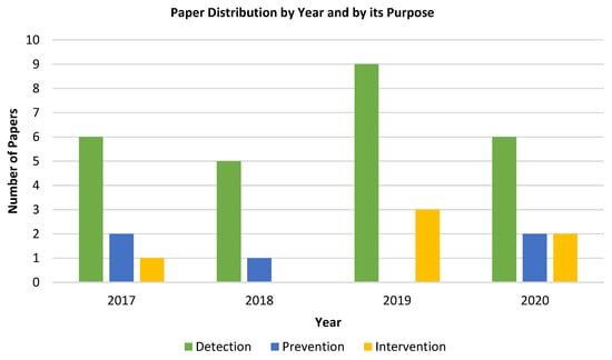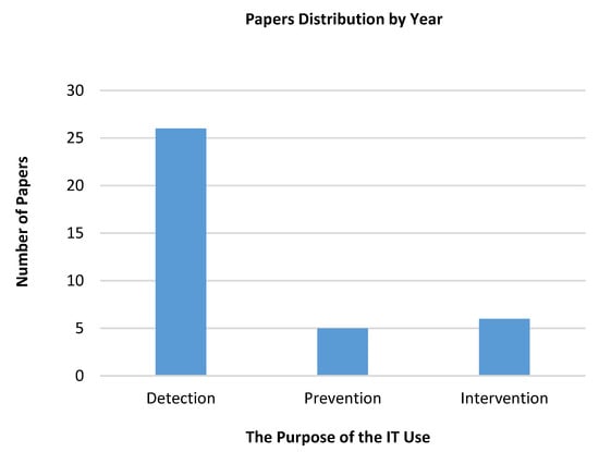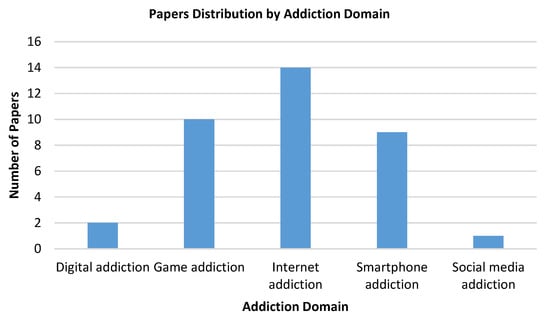 From those 40 papers, we can classify the use of IT in digital addiction into three main purposes: (1) to detect/measure digital addiction, (2) to prevent digital addiction, and (3) to intervene in digital addiction. The number of papers in each category is shown in Figure 5, while the distribution of papers per year and per category are shown in Figure 6. The highest number of papers found is on detection effort. The research on detection is still a trend in digital addiction research, while the studies on prevention and intervention are less common. The studies were conducted in various addiction domains. We found 14 studies conducted in the internet addiction domain, 10 studies in the game addiction domain, 9 studies in the smartphone addiction domain, 1 study in the social media addiction domain, and 2 studies in the general context of digital addiction. The distribution of papers by its domain is shown in Figure 7.