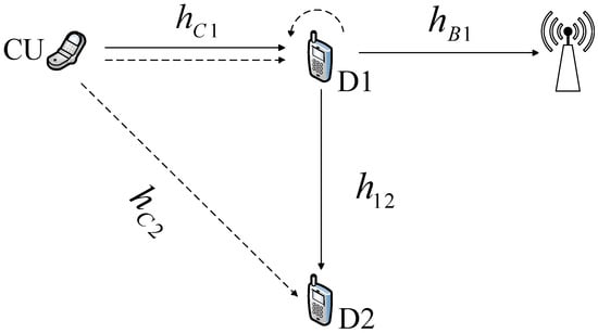The increasing use of wireless devices has led to explosive growth in data traffic, so wireless spectrum resources are becoming increasingly scarce [,,]. D2D communication as an underlying network can share the cellular communication resources to realize information transmission between D2D users, which improves the utilization of spectrum resources [,]. At the same time, the D2D cellular network has reliable synchronism by using the joint detection method []. In [], the power control problem is studied by using a game-theoretic method based on sigmoid cost function for the underlying D2D network. Furthermore, when the distance between the CU and the base station (BS) is very long, the D2D user can act as a relay to assist the cellular link transmission. By using cooperative protocols, such as amplify and forward (AF), decode and forward (DF) and quantize and forward (QF), the cooperative D2D communication not only ensures reliable and effective information transmission [,], but also reduces the performance degradation of the CUs caused by the D2D users reusing the cellular networks spectrums. Therefore, both the CUs and the D2D users can benefit from the cooperation, and some existing studies have shown that D2D-assisted cellular networks can better improve system performance. In [], a two-way communication scheme between BS and CU in two time slots based on D2D assistance is proposed. On this basis, considering the interference caused by the D2D reuse of cellular network resources, a superposition coding scheme [] is proposed at the D2D transmitter and the power allocated to assist the downlink transmission of the cellular is minimized. Considering multiple D2D pairs and CUs, the weighted sum energy efficiency [] of the D2D user is maximized through bandwidth allocation, power allocation, and selection of the optimal D2D user as a relay. In addition, Kim et al. propose a half-duplex (HD) D2D-assisted cooperative relay system [] using non-orthogonal multiple access which can achieve maximum total capacity scaling.