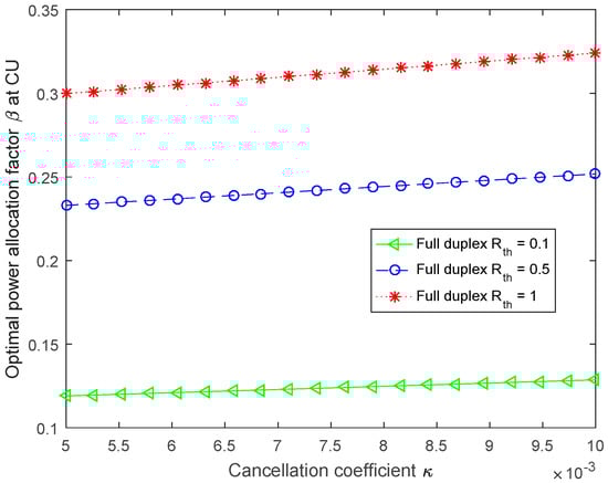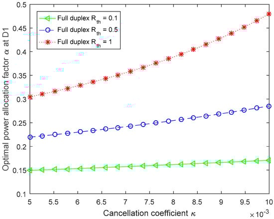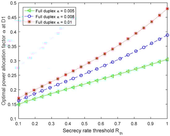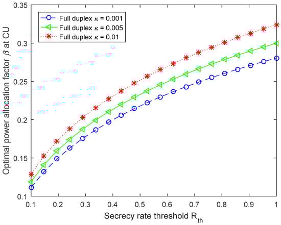 Figure 5 displays the optimal allocation factor versus the cancellation coefficient , in which the secrecy rate thresholds are set as 0.1, 0.5 and 1, respectively. From Figure 5, when the secrecy rate threshold is 1, the optimal power allocation factor is greater than that when the secrecy rate threshold is 0.1 and 0.5. Specifically, when the cancellation coefficient is 0.008, the power allocation factor with is greater than that with , and about 0.2 larger than that with .