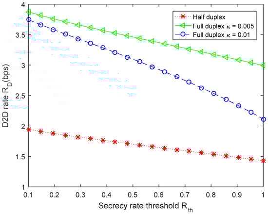 The D2D link rate versus secrecy rate threshold in the proposed FD scheme and the conventional HD scheme is shown in Figure 4. As can be seen from Figure 4, the output performance of the proposed FD scheme is better than the HD scheme, and the D2D link rate decreases as the secrecy rate threshold increases. Furthermore, the D2D link rate with in the proposed FD scheme is less than with .