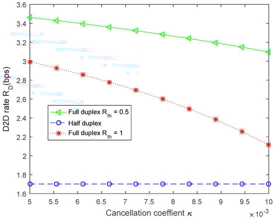 Figure 7 compares the optimal D2D link rates of our proposed FD scheme and the conventional HD scheme with various cancellation coefficient . Obviously, the performance of the conventional HD scheme where the cancellation coefficient ranges from 0.005 to 0.01 is worse than the proposed FD scheme. When the cancellation coefficient is 0.005, the D2D link rate in the proposed FD scheme is approximately 1.8 bps larger than that of the conventional HD scheme. Moreover, the D2D link rate is better than that in the proposed FD scheme.