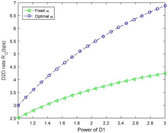 Figure 8 compares the optimal D2D link rates of two schemes, which concludes the scheme with the optimal power allocation factor at D1 and the scheme with fixed power allocation factor versus various power of D1. The fixed power allocation factor is set as 0.4. It can be seen that the optimal power allocation factor scheme can achieve a larger D2D link rate as compared to the scheme with the fixed . In the proposed scheme, the D2D rate is about 6.9 bps, while in the fixed power allocation factor scheme, the D2D rate can only achieve approximately 4.2 bps. In addition, the optimal D2D link rates become good with the increase of the power of D1.