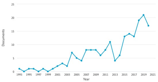 N. of published articles on Information and Communication Technologies (ICT) adoption in agriculture water management. Source: own elaboration from data obtained with the search in Scopus (dated 30/08/2020) having the following parameters: TITLE-ABS-KEY ((ICT OR DSS OR “climate services”) AND agriculture AND (“water management” OR irrigation)).