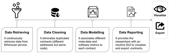 To access the smart contracts’ source codes, the developers must resort to other means or to code repositories, such as the classical GitHub or similar resources. Fortunately, in the last few years, EtherScan (https://etherscan.io/) and other web sites have started providing smart-contract checking as a service, so that Ethereum developers can submit their source code to be analyzed and the source code is made available afterwards by the website. However, there is an odd side of the medal for many reasons: access to this body of knowledge is far from easy and far from fast; it is not structured and organized; and the smart-contract metrics are not available and must be computed separately. All these tasks can and need to be automatized to save developers time and work as well as computational resources. Indeed, in the last few years, a number of research papers have been published reporting findings based on smart contracts’ source codes, mined from GitHub or some Ethereum block explorer such as EtherScan [5,6,7,8]. However, when conducting this kind of empirical research on smart contracts with data from Ethereum blockchain, the abovementioned tasks need to be carried out by the developers themselves. The first task is downloading the smart contracts’ source codes to be analyzed. One way to download smart contracts’ source code data is to inspect open-source software (OSS) project repositories such as GitHub [9].