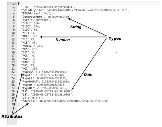 Unlike the tools discussed in the related work of Section 2, Smart Corpus associates different metrics (intrinsic metrics and extrinsic metrics) to the smart contracts, aiming to facilitate the selection of a smart-contract set that meets precise requirements. The metrics associated with the smart contracts are then stored in a document-oriented database. Figure 3 shows the database schema of a smart contract.