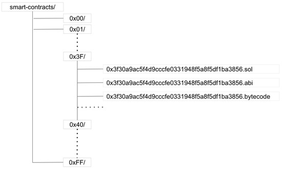The smart contracts’ source code is stored in a file system and is organized in folders and subfolders to ease the navigation. Figure 4 shows the subdirectory structure. The first leaf corresponds to the first two letters of the smart-contract address, and then, each directory contains the file named using the full address of the smart contract and three different extensions, respectively .sol for the Solidity source code, .abi for the ABI and .bytecode for the byte code.