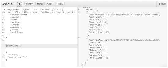 Listing A1 displays a GQL query that returns smart contracts’ addresses having more than 20 methods defined in a contract. Listing A2 displays the query results in the JSON format. The query output, in addition to the smart contract’s addresses, contains various information (intrinsic metrics) such as the number of events, the number of functions, the number of modifiers and the number of payables, as specified by the query A1,