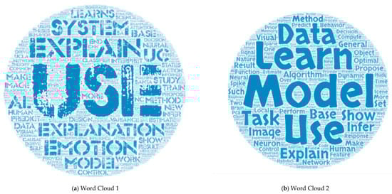 The word cloud plots (Figure 2a,b) are an easy way of understanding the composition of the ‘explainability’ concept and the related semantic meaning across the ML-driven databases chosen for this study. Here, essential words were perceived as those that first appeared in a 20-word window following a search of the term ‘explanation’; such words also had a frequency above the average level. In Figure 2a, it is evident that the corpus reveals the prominent words as use, explanation, model, and emotion. Other notable words are learn and the system. The corpus (in Figure 2b) shows well-known words as model, learn, use, and data. Other prominent words are method, task, infer, and image. There are also essential words such as decision and prediction appearing within the 20-word window. Thus, the AI community in Figure 2a describes the term explainability as being related to words such as use, explanation, and model, among others, suggesting an emphasis on using system models that enhance learning, explanation, decision making, and prediction. The implication (in Figure 2b) is that the term explainability could be taken to mean using models that allow learning, ease of inference, and prediction, among others.