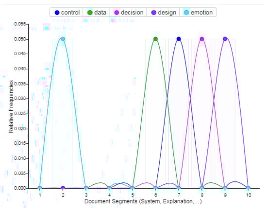 The corpus generated from the word cloud (in Figure 2a) reveals that the 20 most prominent words are as follows: system, explanation, model, emotion, learn, use, study, train, method, predict, data, estimate, control, result, show, decision, interpret, design, variance, image). Analyzing this corpus to formulate a connection between the words and generate meaning using voyant-tools.org (an open-source corpus analysis program) revealed that the most prominent words, as seen in Figure 3, were as follows: control; data; decision; design; emotion.