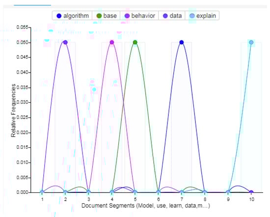 Many meaningful sentences in the context of responsible XAI can, therefore, be formed from combining these words. For example, the words could be brought together to imply ‘a design of data control that enhances decision making’ or ‘designing and controlling data in such a way that enhances emotion and decisions’. The corpus from word cloud 2 reveals 20 words as the most prominent (model, use, learn, data, method, predict, behavior, task, perform, base, show, infer, image, algorithm, propose, optimal, object, general, explain, network). Voyant analysis revealed that five words were the most prominent words: action; algorithm, base, behavior, data, and explain, as seen in Figure 4 below.