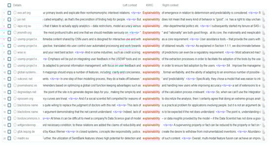 Possible sentences from this word combination include: ‘an algorithm that explains data behavior’ or ‘an algorithm behavior that is based on data explanation’. Additionally, upon looking for the concordance of the term ‘explainability’ in sketchengine.eu (an open-source program that analyses how real users of a given language use certain words), some terms emerged as critical definitional terms of the word: predictability, verifiability, user feedback, information management, data insights, analytics, determinism, understanding, and accuracy, as seen in Figure 5 below.