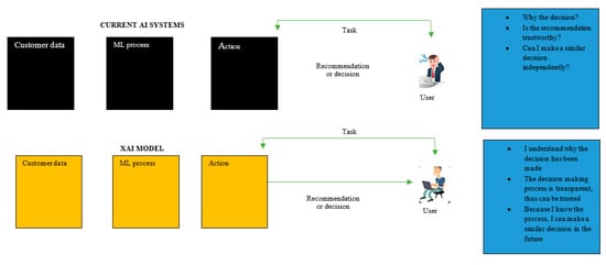 There is an increasing need to enhance user confidence in AI systems [25]. User confidence and trust are cited as the primary reasons for pursuing explainable AI. System users seek explanations for various reasons—to manage social interactions, assign responsibility, and persuade others. A critical aspect of explainable AI is that it creates an opportunity for personalized human–computer interaction. Instead of the brick and mortar models of decision-making techniques that cannot be understood or interpreted by humans, explainability ensures that the customer journey through machine learning and AI systems is modeled in a way that mimics human interactions. There is a need for machine learning to explain why and how individual recommendations or decisions are made [26]. The implication is that consumers’ activity on AI systems will be complemented to make better and accurate decisions faster. Thus, organizations will be able to leverage customer value. When giving advice, recommendations, or even descriptive aspects, looking for justifications and reasons behind the recommended action is important. It is not enough to predict or suggest outcomes as the best or the preferred action without showing connections between the data and the factors involved to arrive at the decisions [26].
