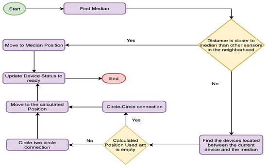 Another novel algorithm for Coverage Maximization of Heterogeneous Wireless Network () is proposed in [27]. The algorithm is centralized. Devices are heterogeneous and the sensing range of each device has a circular shape. The circumference of the circle is represented as an interval of an angle (0, 2). For any two connected devices and with sensing ranges and respectively, the distance between them is less than the sum of their ranges. A device moves (after random deployment) to a position that ensures a maximum coverage and connects to a closest device to maintain connectivity. The main goal is to keep the movement of devices as minimal as possible to save energy. Another goal is to reduce the overlapping areas covered by different devices and keep it to a small margin to maximize the coverage while maintaining connectivity. ensures that every device is connected to at least devices. In this algorithm, the notion of ratio is introduced. It adds flexibility in controlling the overall displacement in the network.