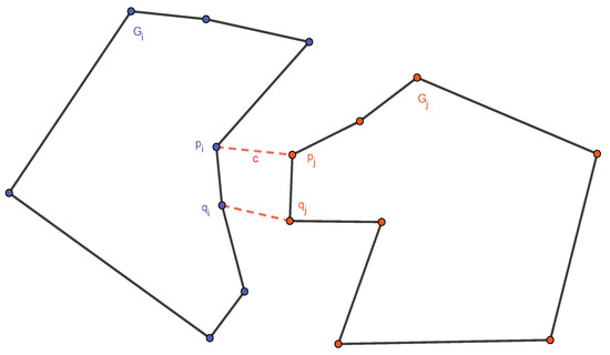 After determining the boundaries of each island , this bridging process starts finding the minimal distance between any two adjacent boundary sets. Computing the minimum distance between two islands and (Figure 5) is a well-studied problem in computational geometry [29].