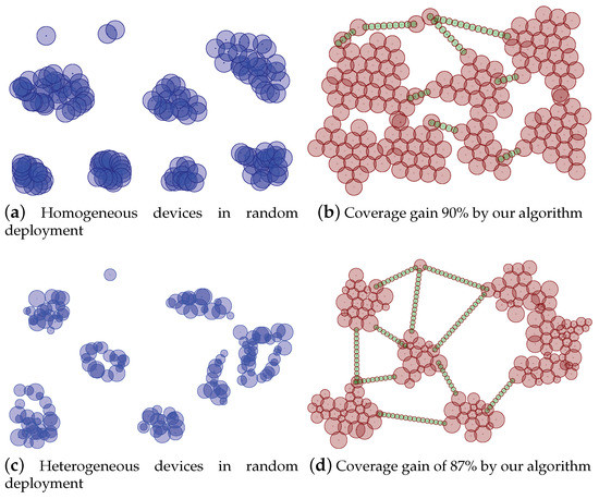 Figure 6 shows the simulation results for 150 devices in both heterogeneous and homogeneous environments. The blue colored figures represent the deployment before applying our algorithm, the red colored figures represent the result after applying our algorithm and the green circles represent drones.