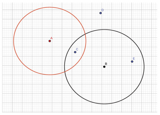 As for the coverage gain, we adopt the evaluation method of Abo-Zahhad et al. in [10]. We treat the Area of Interest (AoI) as a matrix C of dimension . presents the cell at position in the matrix C where is a row in C, and is a column C. To exemplify, Figure 7 shows the distribution of two devices in the matrix (the red circle) and (the black circle). The point D is uncovered, which means there is no device covering this point. The point C is covered by two devices and . The point E is only covered by the device .