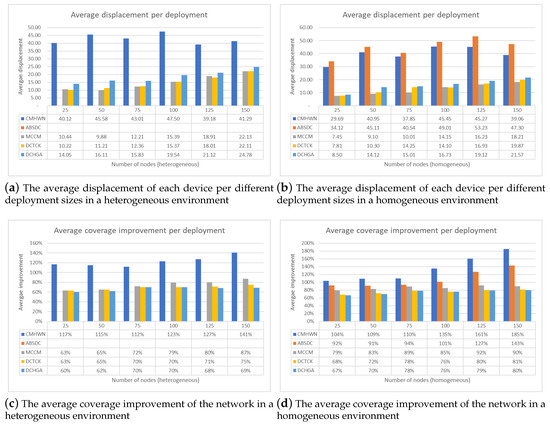 Table 3 summarizes the average overall performance of compared to the distributed algorithms and in homogeneous and heterogeneous environments. It increases the coverage gain up to 19% and reduces the nodes displacement by 35.55% compared to the algorithms in the table. In the next section, the results obtained in Figure 8 are interpreted from the energy saving perspective.